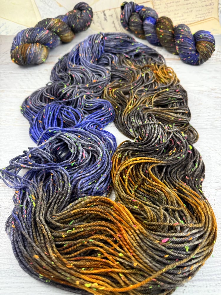 This limited edition yarn base is so fun! It has little bits of tweed-like neon specks throughout the skein. It's like fallen leaves peeking through fall/halloween colors. Perfectly witchy!