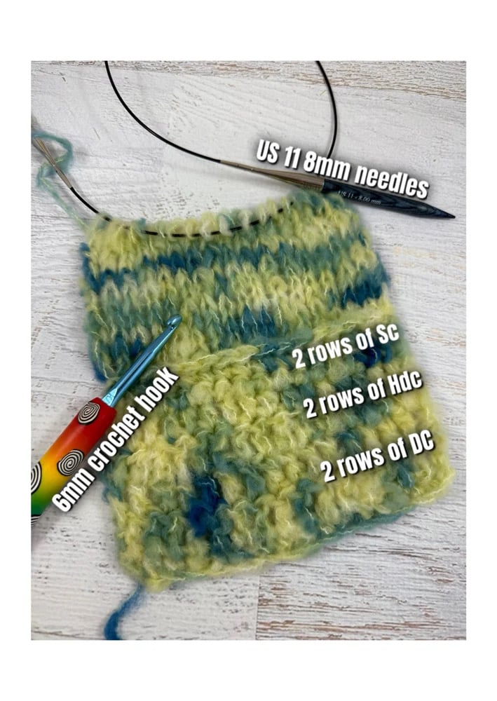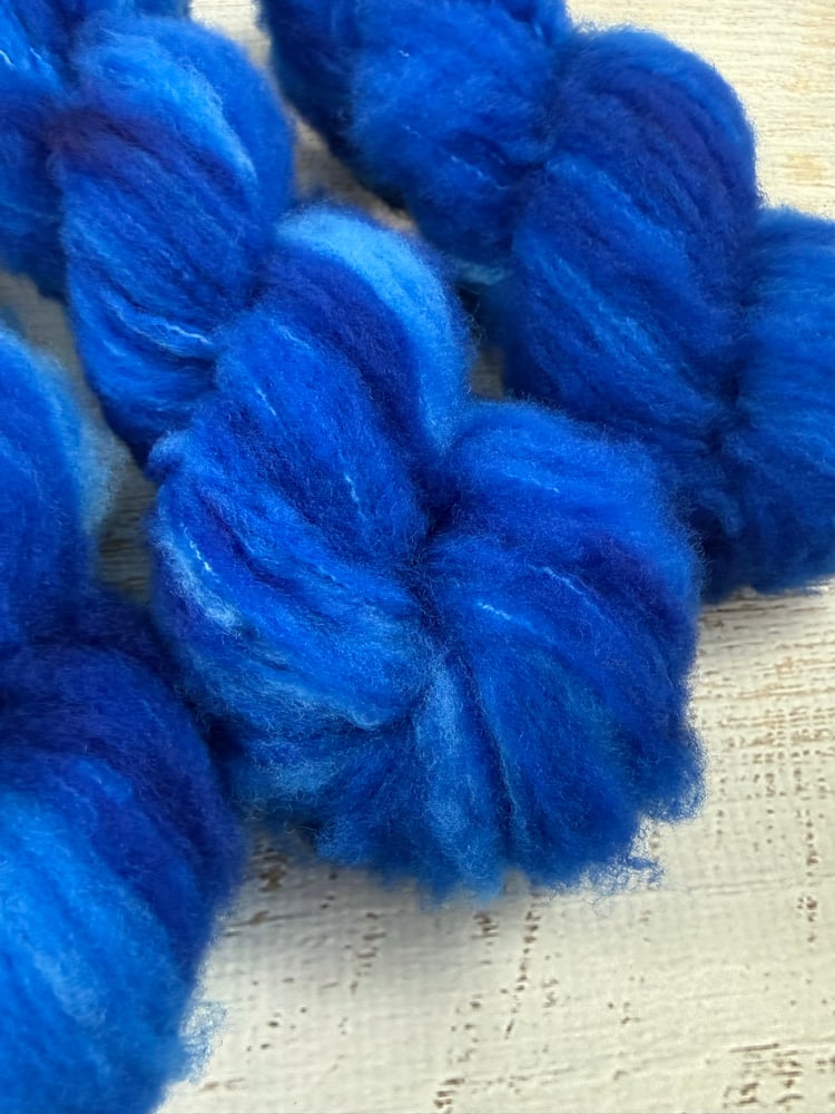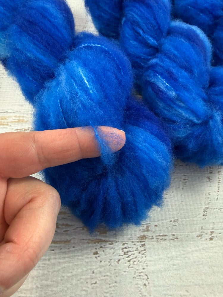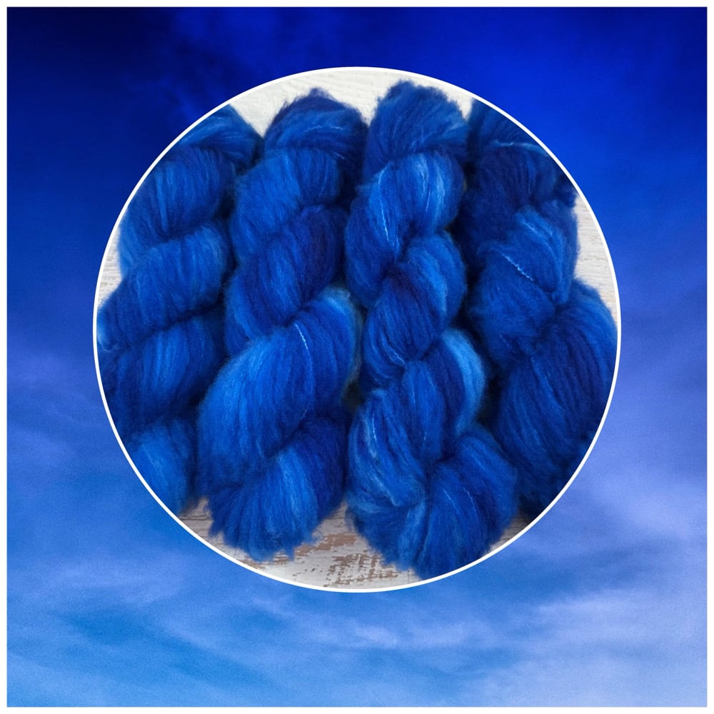 Sky blue fuzzy skeins feel like playing in the clouds. They look like they could be mohair, but they are actually brushed superwash merino. These skeins are SOOOO fluffy I keep giggling everytime I touch them. They are extremely soft and every touch is like a dopamine hit of pure joy. They are happiness in yarn from. (The last photo is to show you how this yarn looks crocheted and knit; with a larger hook and knitting needles this yarn makes a lovely airy fabric).