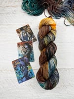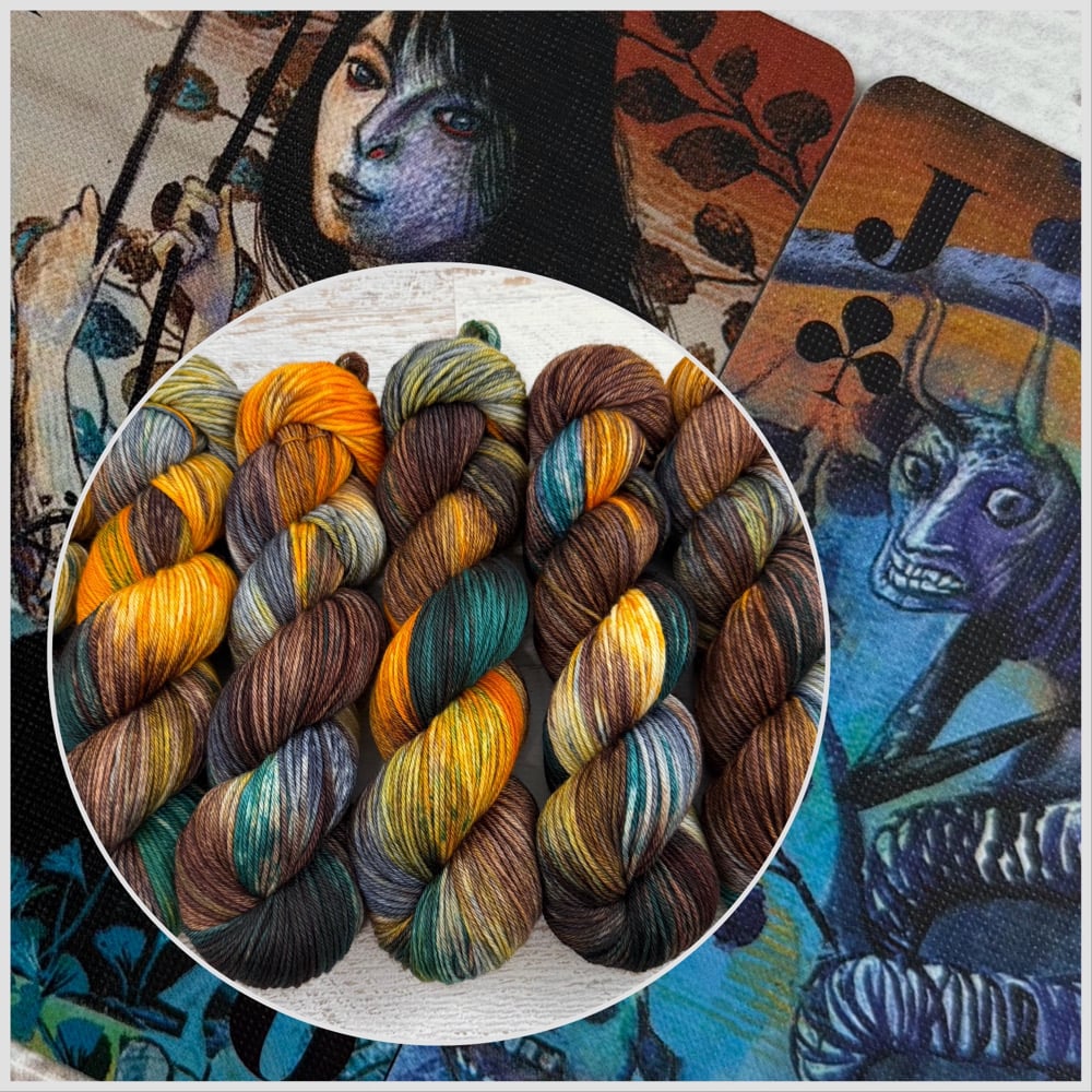 The inspiration for these colorways comes from a very cool deck of playing cards. The artwork on the cards is from John Littleboy's brain, and sold on the website Artiphany. I got the Bag of Bones set. These cards are seriously so cool! Every suit tells a different story.