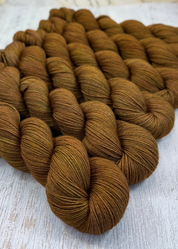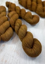 This is my favorite earth-tone dye color, and when dyed on this naturally light gray base, it has an even richer gold tone. It's lovely. A few of these skeins have darker sections were the dye didn't dissolve (as shown in the last photo). It shouldn't be noticeable when stitched up, but I did want to let you know.